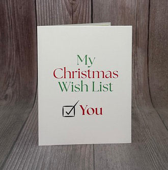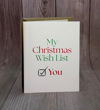 On the front of this card reads, “My Christmas List,” with a box marked “You” next to it. Inside is a blank, cream-colored insert for you to write your personal message to the recipient. This card comes with a parchment-colored envelope that is pre-taped and ready to be sealed.