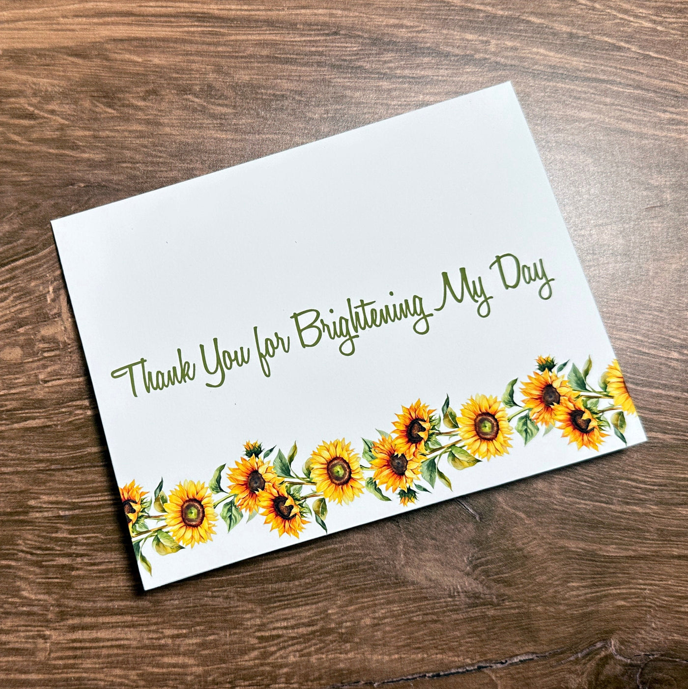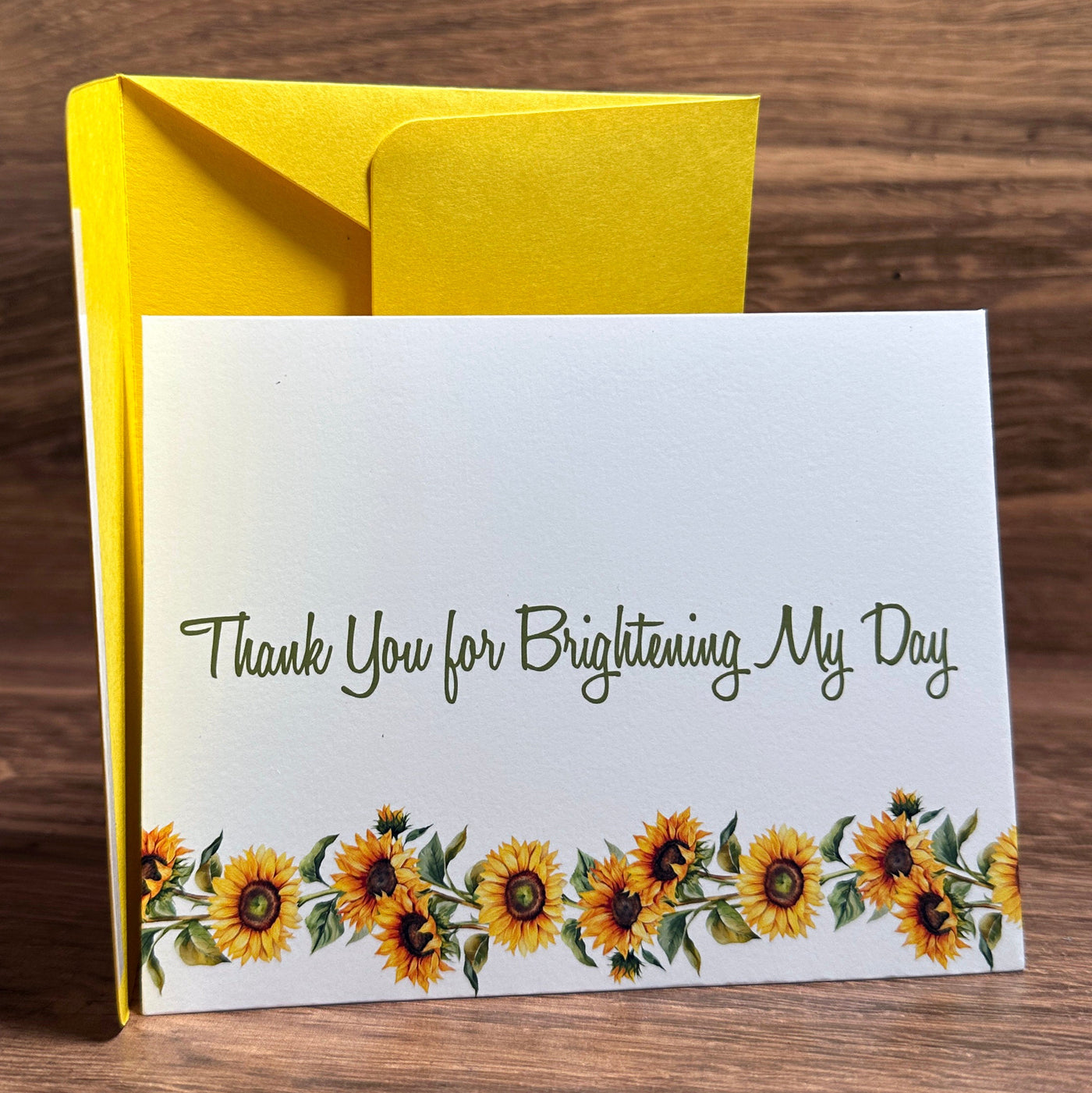 On the front of this card are the words, "Thank You for Brightening My Day," printed in green, and below is a row of bright sunflowers. Inside is a blank, cream-colored insert for you to write your personal message to the recipient. This card comes with a yellow envelope that is pre-taped and ready to be sealed.