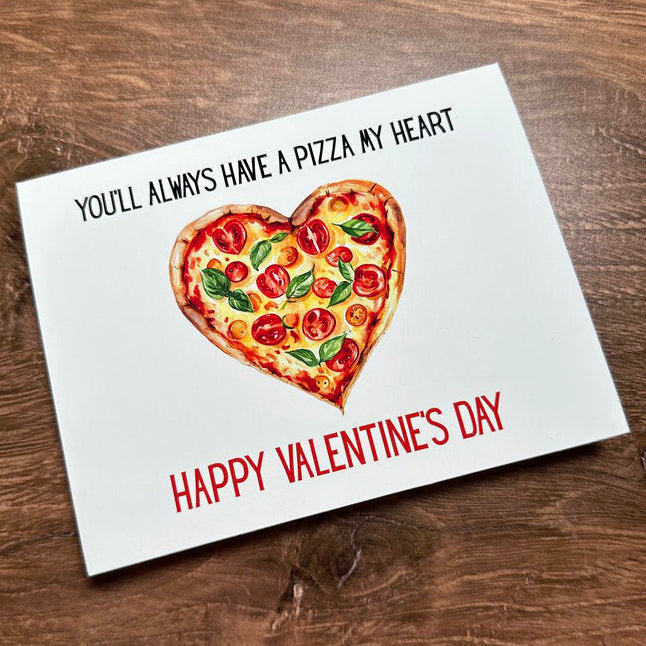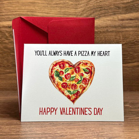 On the front of this card, in black, reads, "You'll Always Have a Pizza My Heart." In the center is a heart-shaped pizza, and below, in red, reads, "Happy Valentine's Day." Inside is a blank, cream-colored insert for you to write your personal message to the recipient. This card comes with a pre-taped red envelope that is ready to be sealed.
