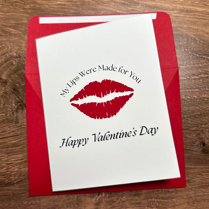 On the front of this card, in black, it reads, "My Lips Were Made for You." In the center is a red pair of lips, with the words "Happy Valentine's Day" in black below. Inside is a blank, cream-colored insert for you to write your personal message to the recipient. This card comes with a pre-taped red envelope that is ready to be sealed.